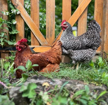 Our family of four is joined by three sun-bathing dogs, four eccentric hens, a watchful rooster, and two cats who ensure the house remains mouse-free.